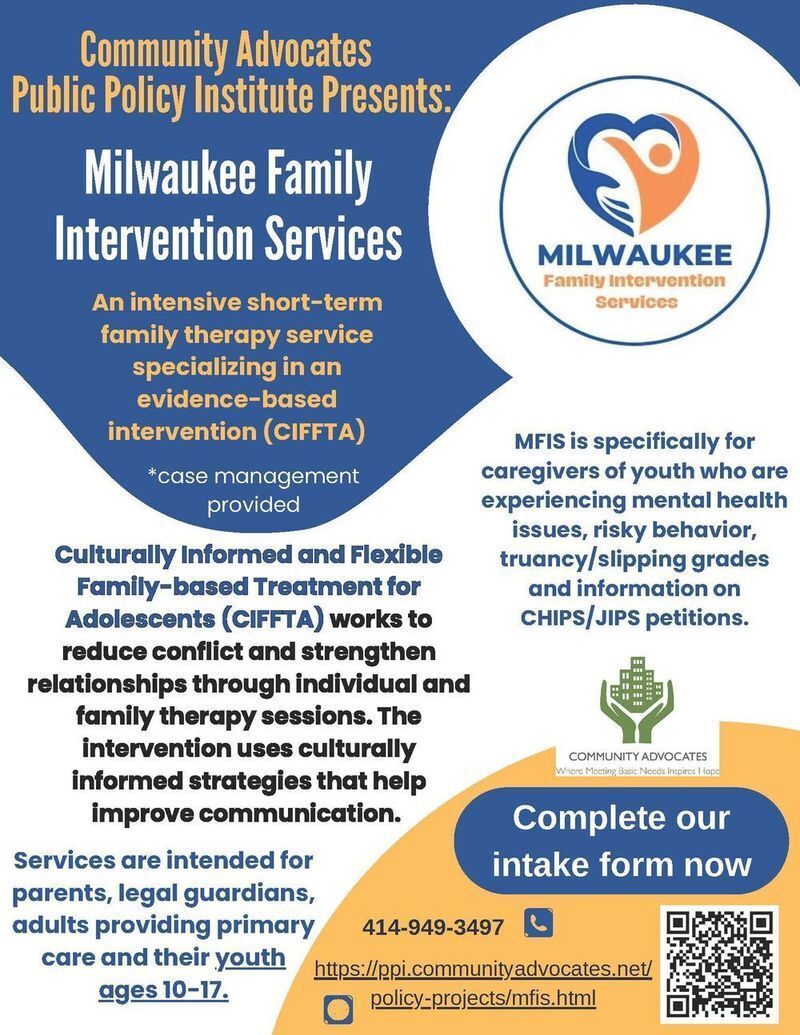 Milwaukee Family Intervention Services (MFIS) is a case management program serving Milwaukee County residents in need of intervention services for their family. MFIS is specifically for caregivers and youth experiencing mental health issues, behavioral concerns, truancy, educational concerns and CHIPS/JIPS petitions.
